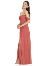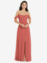 【NEW】【STYLE: 3105】オフショルダー ドレープ 袖 マキシ ドレス 前面 スリット【COLOR: Coral Pink】【SIZE: 00-30W】