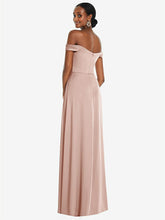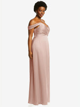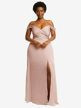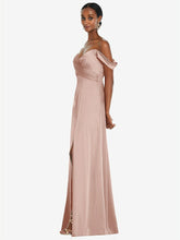洗練されたこのささやきのサテンガウンは、包まれたドレープされたボディスのようなエレガントなディテールを包み込み、肩から外れたシルエットのために袖を飛ばします。太ももの上にスリットされたフルAラインのスカートが、通路やダンスフロアを横切って美しく流れます。