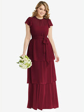 【NEW】【STYLE: 3116】フラッター スリーブ ジュエル 首 シフォン マキシ ドレス ティア ラッフル スカート【COLOR: Burgundy】【SIZE: 00-30W】