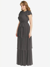 【NEW】【STYLE: 3116】フラッター スリーブ ジュエル 首 シフォン マキシ ドレス ティア ラッフル スカート【COLOR: Caviar Gray】【SIZE: 00-30W】