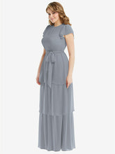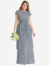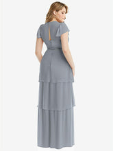 【NEW】【STYLE: 3116】フラッター スリーブ ジュエル 首 シフォン マキシ ドレス ティア ラッフル スカート【COLOR: Platinum】【SIZE: 00-30W】