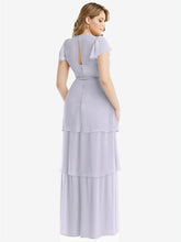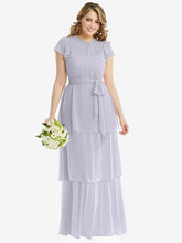 【NEW】【STYLE: 3116】フラッター スリーブ ジュエル 首 シフォン マキシ ドレス ティア ラッフル スカート【COLOR: Silver Dove】【SIZE: 00-30W】