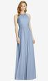見事でシンプルなこのLux Chiffon Bridesmaidドレスのフルレングスのシルエットは、背面の開いた三角形の細部とバランスが取れています。集まったホルターのネックラインは、自然なシャーリングされた中間とスカートを反映しています。