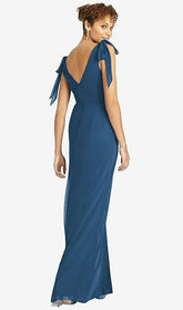 肩と深いVバックでネクタイのディテールを備えたフルレングスノースリーブVネックラックスシフォンドレス。サイドフロントにスリットが付いた人魚のスカート。