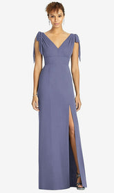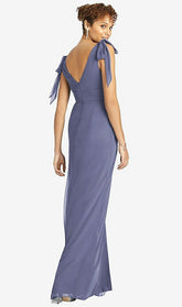 肩と深いVバックでネクタイのディテールを備えたフルレングスノースリーブVネックラックスシフォンドレス。サイドフロントにスリットが付いた人魚のスカート。