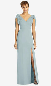 肩と深いVバックでネクタイのディテールを備えたフルレングスノースリーブVネックラックスシフォンドレス。サイドフロントにスリットが付いた人魚のスカート。