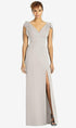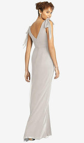 肩と深いVバックでネクタイのディテールを備えたフルレングスノースリーブVネックラックスシフォンドレス。サイドフロントにスリットが付いた人魚のスカート。