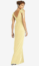 肩と深いVバックでネクタイのディテールを備えたフルレングスノースリーブVネックラックスシフォンドレス。サイドフロントにスリットが付いた人魚のスカート。