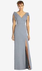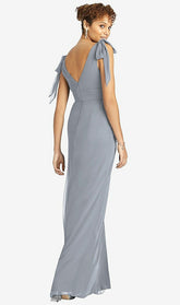 肩と深いVバックでネクタイのディテールを備えたフルレングスノースリーブVネックラックスシフォンドレス。サイドフロントにスリットが付いた人魚のスカート。