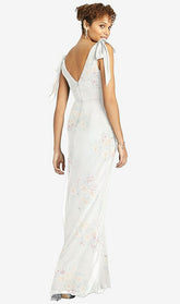 肩と深いVバックでネクタイのディテールを備えたフルレングスノースリーブVネックラックスシフォンドレス。サイドフロントにスリットが付いた人魚のスカート。