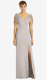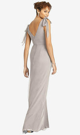 肩と深いVバックでネクタイのディテールを備えたフルレングスノースリーブVネックラックスシフォンドレス。サイドフロントにスリットが付いた人魚のスカート。