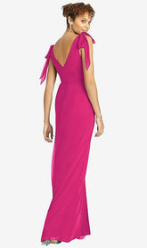 肩と深いVバックでネクタイのディテールを備えたフルレングスノースリーブVネックラックスシフォンドレス。サイドフロントにスリットが付いた人魚のスカート。