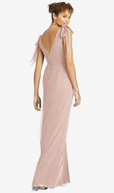 肩と深いVバックでネクタイのディテールを備えたフルレングスノースリーブVネックラックスシフォンドレス。サイドフロントにスリットが付いた人魚のスカート。