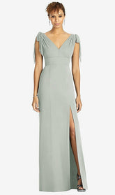 肩と深いVバックでネクタイのディテールを備えたフルレングスノースリーブVネックラックスシフォンドレス。サイドフロントにスリットが付いた人魚のスカート。