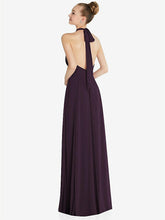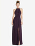 【NEW】【STYLE: 6865】ホルター バックレス マキシ ドレス クリスタル ボタン フリル プラケット【COLOR: Aubergine】【SIZE: 00-30W】