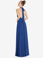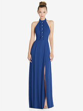 【NEW】【STYLE: 6865】ホルター バックレス マキシ ドレス クリスタル ボタン フリル プラケット【COLOR: Classic Blue】【SIZE: 00-30W】