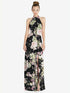 【NEW】【STYLE: 6865】ホルター バックレス マキシ ドレス クリスタル ボタン フリル プラケット【COLOR: Noir Garden】【SIZE: 00-30W】