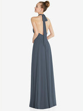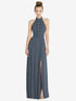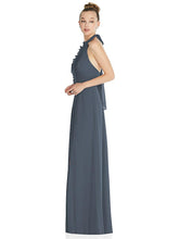 【NEW】【STYLE: 6865】ホルター バックレス マキシ ドレス クリスタル ボタン フリル プラケット【COLOR: Silverstone】【SIZE: 00-30W】
