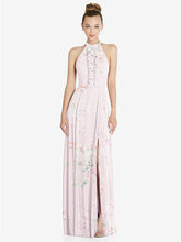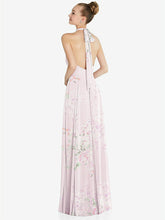 【NEW】【STYLE: 6865】ホルター バックレス マキシ ドレス クリスタル ボタン フリル プラケット【COLOR: Watercolor Print】【SIZE: 00-30W】