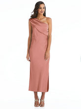 優雅でドレープされたネックラインは、このコンバーチブルのワンショルダースリップドレスにギリシャン風の優雅さを追加します。デリケートなLux Charmeuseファブリックは、魅力的なサイドスリットを備えた洗練されたシルエットと流れるミディスカートを形成します。