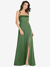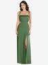 【NEW】【STYLE: 8214】スキニー タイショルダー サテン マキシ ドレス 前面 スリット【COLOR: Vineyard Green】【SIZE: 00-30W】