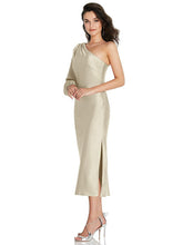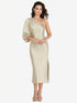 【NEW】【STYLE: 8215】ワンショルダー パフ スリーブ MIDI バイアス ドレス サイド スリット【COLOR: Champagne】【SIZE: 00-30W】