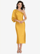 【NEW】【STYLE: 8215】ワンショルダー パフ スリーブ MIDI バイアス ドレス サイド スリット【COLOR: NYC Yellow】【SIZE: 00-30W】