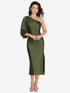 【NEW】【STYLE: 8215】ワンショルダー パフ スリーブ MIDI バイアス ドレス サイド スリット【COLOR: Olive Green】【SIZE: 00-30W】