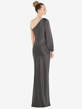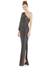 少し陰と陽エネルギーは、このフォーマルなルクスのcharmeuseのガウンに遊び心のあるオーラを貸します。ドラマチックなワンショルダーシルエットは、渦巻く司教の袖と、床に落ちるマキシスカートとペアになっており、非常に柔らかい外観になります。