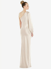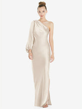 少し陰と陽エネルギーは、このフォーマルなルクスのcharmeuseのガウンに遊び心のあるオーラを貸します。ドラマチックなワンショルダーシルエットは、渦巻く司教の袖と、床に落ちるマキシスカートとペアになっており、非常に柔らかい外観になります。