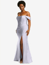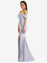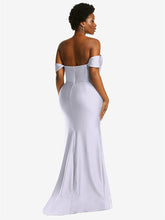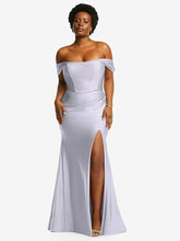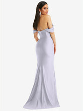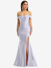 光沢のある輝きを提供する豪華なストレッチサテンから作られた、この印象的なオフショルダーの床の長さのガウンのscar色ステップ。ドレープされたキャップスリーブはゆるく垂れ下がっていますが、コルセットボディスは砂時計のシルエットを強化し、オプションのカップは追加のサポートとクーベンジを提供します。微妙な列車と魅力的なフロントスリットを備えた掃除されたプリーツの人魚のスカートは、忘れられない外観を作り出します。