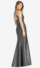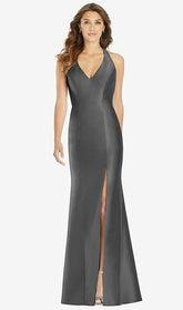 【NEW】【STYLE: D761】Vネック ホルター サテン トランペット ガウン【COLOR: Gunmetal】【SIZE: 00-30W】