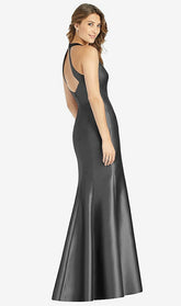 【NEW】【STYLE: D761】Vネック ホルター サテン トランペット ガウン【COLOR: Pewter】【SIZE: 00-30W】