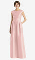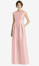 バトーのネックラインとキャップスリーブを備えたフルレングスのサテンツイルドレス。ポケット付きのプリーツスカート。