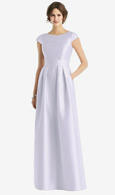 バトーのネックラインとキャップスリーブを備えたフルレングスのサテンツイルドレス。ポケット付きのプリーツスカート。