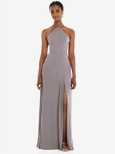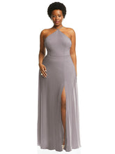 このラックスシフォンガウンに注意を払うダイヤモンドホルターネックラインで魅力を抱きしめます。自然なウエストを備えたフォーマルなデザインであるこのマキシドレスは、太もものスリットと形状を完全に定義する自然なウエストを備えた改変されたサークルスカートを備えた流れるシルエットに放火を作成します。