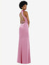 彫像のようなグラマーは、このlux charmeuseのガウンから放射されます。スリット付きのフルレングスのトランペットスカートは細いシルエットを維持しますが、自然なウエストとスタンドの色は、形を見せて肩を強調するための例外的な定義を作成します。