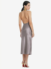 センタースリットは、Lux Charmeuseバイアスドレスを除いて、これにピークアブー効果を作成します。このミディレングスのドレスは、ディテールとエレガンスを追加するスタンドの襟とスカーフで強調されています。オープンバックでセクシーな側面を見せてください。