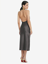 センタースリットは、Lux Charmeuseバイアスドレスを除いて、これにピークアブー効果を作成します。このミディレングスのドレスは、ディテールとエレガンスを追加するスタンドの襟とスカーフで強調されています。オープンバックでセクシーな側面を見せてください。