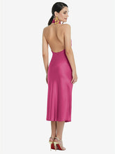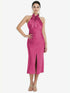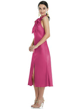 センタースリットは、Lux Charmeuseバイアスドレスを除いて、これにピークアブー効果を作成します。このミディレングスのドレスは、ディテールとエレガンスを追加するスタンドの襟とスカーフで強調されています。オープンバックでセクシーな側面を見せてください。