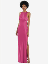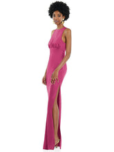 このLux Charmeuseの袖なしのガウンのセクシーなシルエットで控えめな魅力を受け入れます。このフロアレンフスのガウンは、シックな定義を作成する宝石のネックラインとシャーリングボディスで肩を披露します。スライドスリットを備えたバイアススカートは、夜の最後の歌まで踊るための十分な動きを提供するなめらかな見た目を維持します。