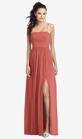 【NEW】【STYLE: TH017】スリム スパゲッティ ストラップ シフォン ドレス 前面 スリット 【COLOR: Coral Pink】【SIZE: 00-30W】
