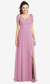 【NEW】【STYLE: TH018】弓肩 Vバック シフォン ガウン 前面 スリット【COLOR: Powder Pink】【SIZE: 00-30W】