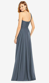 ピーク・アブーの恋人の胴着は、片方の肩のルクス・シフォン・フル・レングス・ブライドメイド・ドレスを薄暗く見せています。かわいくて夢のような、サークルスカートは微妙なドレープを備えた雲のように浮いています。