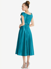 このマットサテンミディドレスの壮大な光沢の中から照らされるように見えます。生意気な余剰の胴着と軽薄なキャップスリーブを備えたこのドレスには、ダンスフロア対応のフルサークルスカートが備わっています。