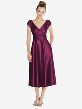 このマットサテンミディドレスの壮大な光沢の中から照らされるように見えます。生意気な余剰の胴着と軽薄なキャップスリーブを備えたこのドレスには、ダンスフロア対応のフルサークルスカートが備わっています。