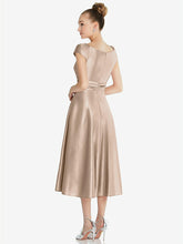 このマットサテンミディドレスの壮大な光沢の中から照らされるように見えます。生意気な余剰の胴着と軽薄なキャップスリーブを備えたこのドレスには、ダンスフロア対応のフルサークルスカートが備わっています。