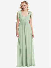 このエレガントでラックスシフォンエンパイアウエストドレスでロマンスを放射します。 3つのルックスを1つ備えたこのゴージャスなガウンは、弓の肩、片方の肩、またはホルターに変換するサッシータイストラップを特徴としています。 Ackowy Shirred Skirtは、この見事なフォーマルドレスの夢のような外観を完成させます。