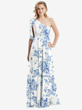 このエレガントでラックスシフォンエンパイアウエストドレスでロマンスを放射します。 3つのルックスを1つ備えたこのゴージャスなガウンは、弓の肩、片方の肩、またはホルターに変換するサッシータイストラップを特徴としています。 Ackowy Shirred Skirtは、この見事なフォーマルドレスの夢のような外観を完成させます。