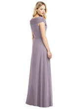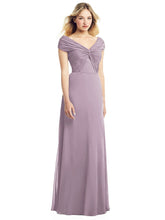 ギャザーが胸元でツイストされたデザインの、幅広オフショルダーロングドレス